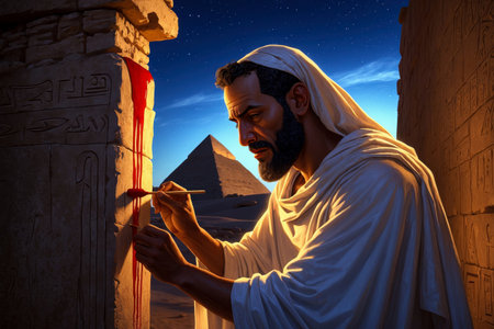 AI Generative Jew man paints door of his home with blood of sacrificial lamb, event of the Jewish Exodus from Egypt