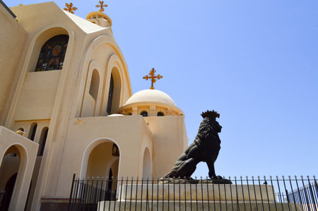 A large black stone lion on the background of an Egyptian orthodox white church with crosses, arches, domes and prayer windows against the blue sky.