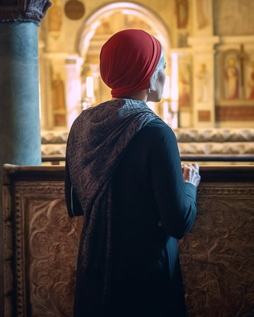 Back view of unrecognizable young woman standing in front of Orthodox coptic As-Samayyun Cathedral Church in Sharm El Sheikh, Egypt