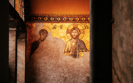 Istanbul, Turkey - October 30, 2019: Mosaic of Jesus Christ in the Hagia Sophia Museum.