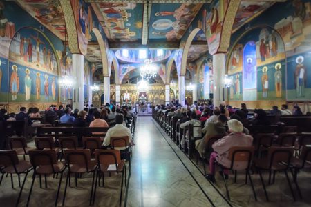 Madaba, Jordan - July 18, 2012: Interior of Greek Orthodox Basilica of St George. with the mosaic map of Holy Land in Madaba, Jordan.