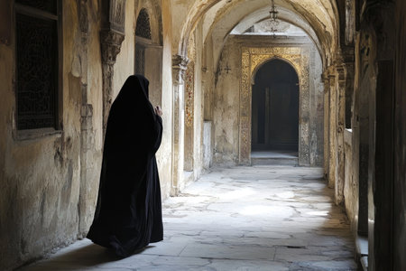 A person in a black robe stands in an ornate, weathered hallway with arched doorways and Islamic architecture, creating an atmosphere of mystery.