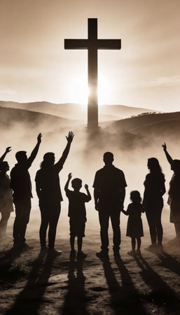 A group of people, including families and children, silhouetted as they raise their hands in worship before a large cross during a misty sunrise, symbolizing faith and hope.