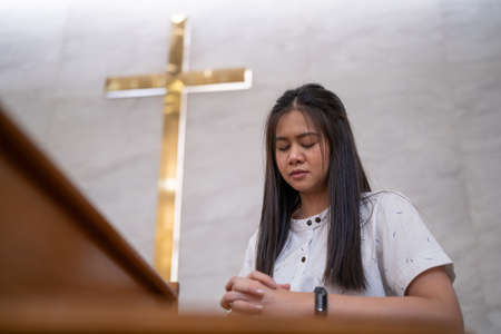 A young Asian Christian couple praying to Jesus Christ in a church.