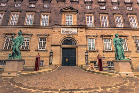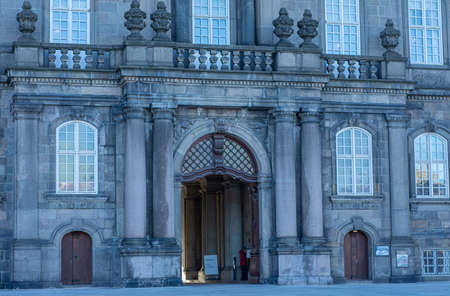 Entrance of Christiansborg Palace in Copenhagen, Denmark. Great building of the Danish Royals under a blue sky on a sunny day