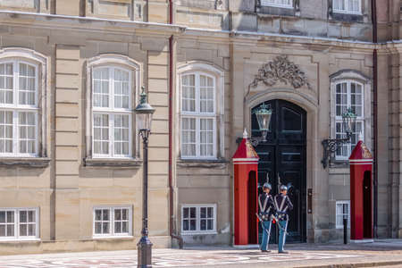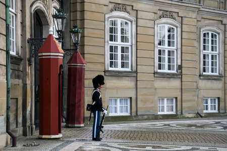Copenhagen, Denmark - August 12, 2016: Soldiers of the Danish Royal Life Guards for the changing of the guards on the central plaza of Amalienborg palace in Copenhagen. It is the home of the Danish royal family.