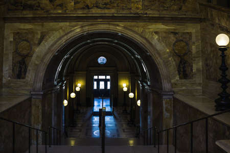 Boston, USA - October 22, 2021: A view on the entrance in the Boston Public Library. Interior of the dark hallway