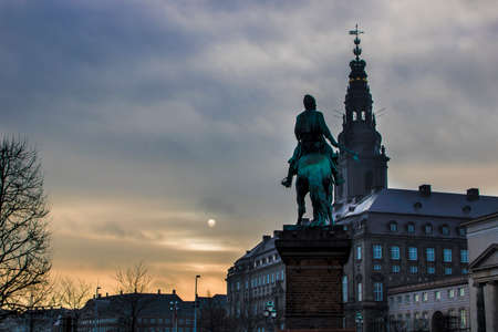 Christiansborg Castle and the Equestrian statue of King Christian IX in the center of Copenhagen, Denmark
