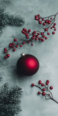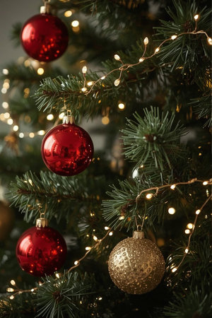 Festive holiday scene with fir branches, red ornaments, and soft lighting creating warm seasonal ambiance.