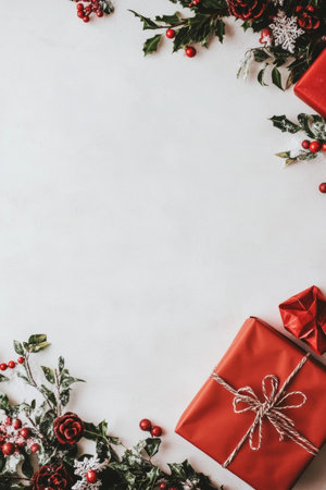 Christmas presents on white with red, green leaves, festive theme