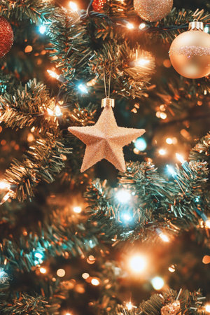 Christmas tree branches adorned with ornaments, colorful decorations, and twinkling lights, festive holiday scene.