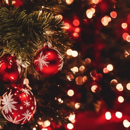 A festive and cozy close-up of a Christmas tree adorned with red ornaments and twinkling lights, with a soft bokeh background.