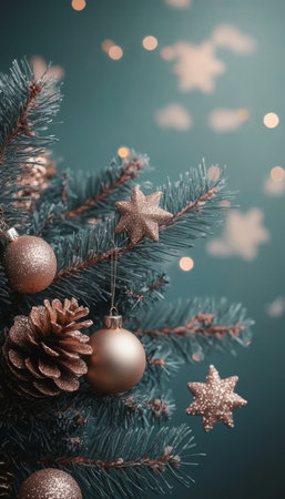 Christmas tree branches adorned with festive ornaments, sparkling lights, and colorful decorations.