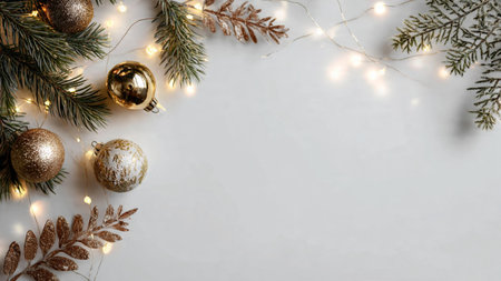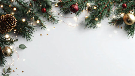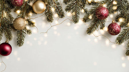 Festive Christmas scene with fir branches, ornaments, and lights.