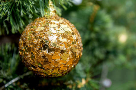 Christmas yellow ball on christmas tree. Gold tree ornament. New Year decorations