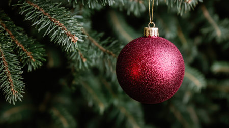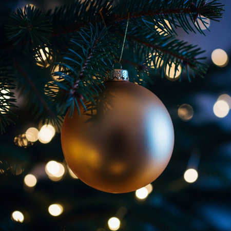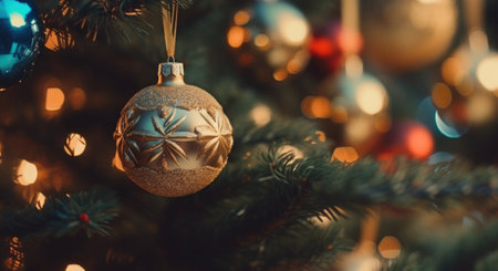 Festive ornaments hang elegantly on a lush green tree creating a warm and cheerful atmosphere for New Year festivities with sparkling lights.