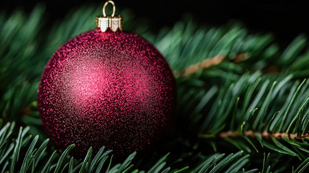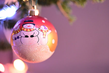 Close-up of a hand-painted Christmas ball depicting a winter landscape, hanging on a pine branch, adding a personal touch to festive holiday decor. winter christmas background