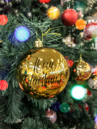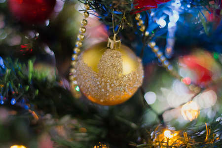 Gold festive glass ball with colored sparkles, Christmas tree and beautiful yellow bokeh of glowing garland. Blurred background.