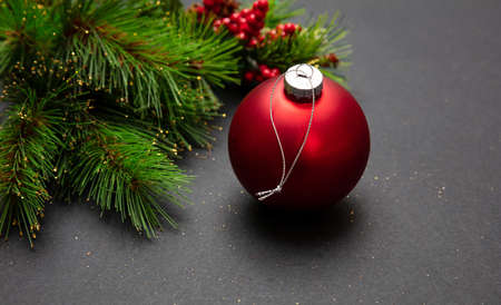Christmas decoration. Xmas ball red color and fir twig against dark gray background, copy space, card template