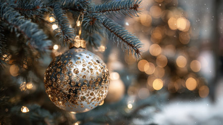 This enchanting image features a detailed Christmas tree ornament that sparkles amidst a backdrop of soft bokeh lights, evoking a cozy and joyful holiday spirit.