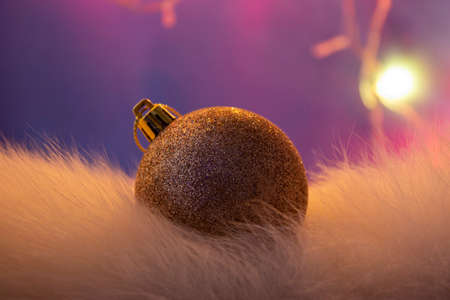 Golden Ball Christmas Ornament on a Purple and Pink Background. Christmas Light Bulbs. Merry Christmas.