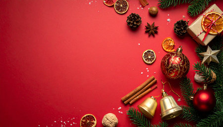 A festive arrangement of Christmas decorations and spices including pine cones, dried oranges, and ornaments on a red background.