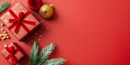 A top-down view of a beautiful Christmas flat lay with presents, fir branches, and shiny balls, providing ample space for a festive message or creative design.