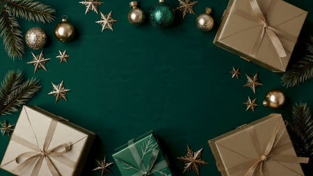 Top down view of a festive Christmas scene. Wrapped presents, red baubles, and ornaments create a frame on a dark green textured background with copy space.