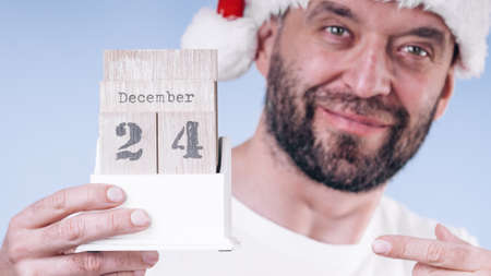 Man wearing santa claus christmas hat holding calendar with 24 december date, on blue