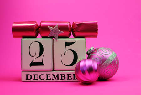 Pink theme Save the Date white block calendar for Christmas Day, December 25, with colorful festive decorations