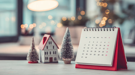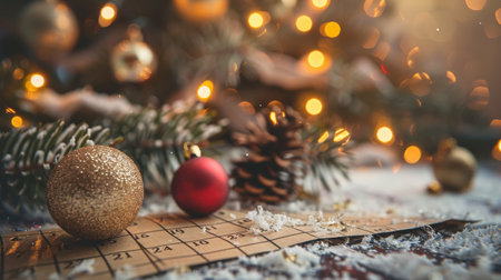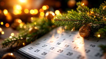 Capture the magic of the holiday season with this festive scene, a calendar marking precious Christmas countdown moments bathed in warm bokeh lights and adorned with pine, perfect for seasonal promotions and heartfelt celebrations.