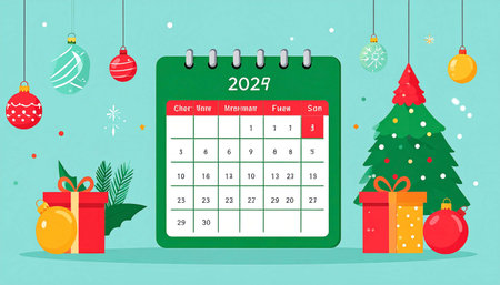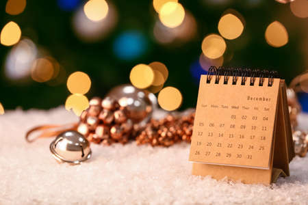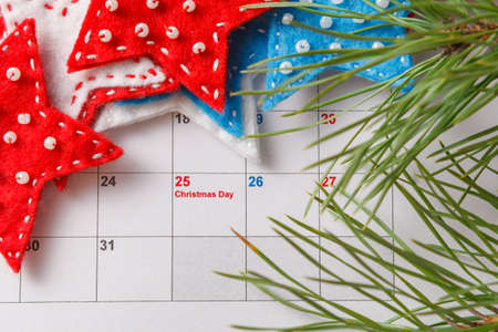 Calendar with date of Christmas and decor on table