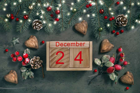 Christmas Eve Date On Calendar, December 24, with Christmas decorations and festive lights on fir twigs, frosted red berries and wooden hearts on green background