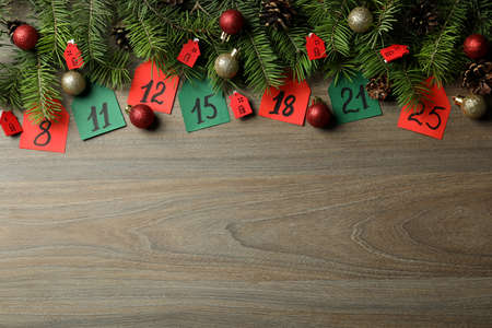 Advent calendar composition on wooden background, space for text.