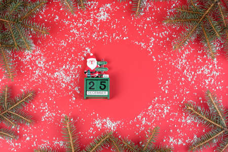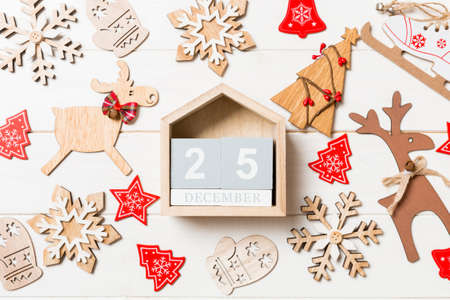 Top view of calendar on Christmas wooden background. The twenty fifth of December. New Year toys and decorations. Holiday concept.
