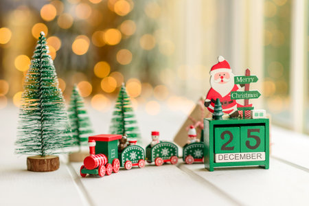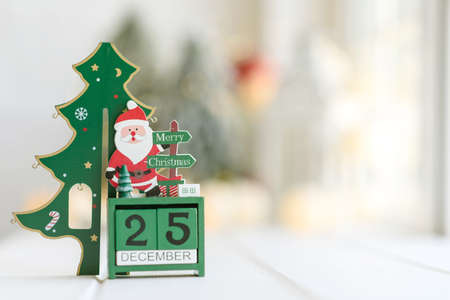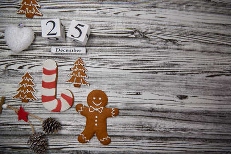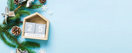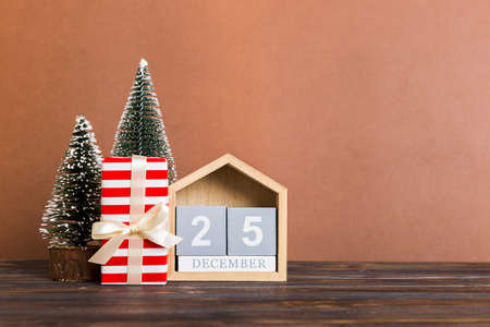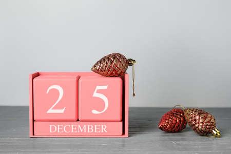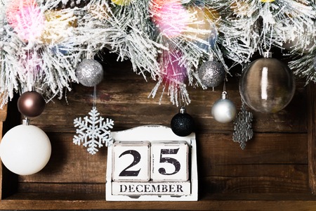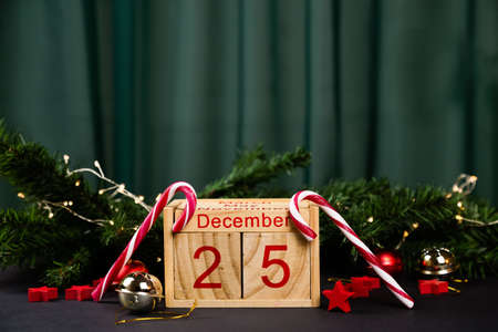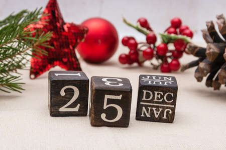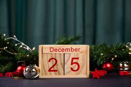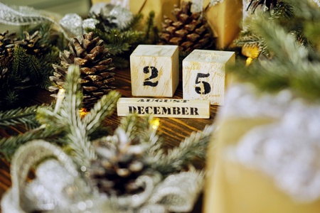 Wooden calendar December 25. Winter and Christmas holidays concept. Cozy scene. Background with christmas decor. Christmas background.