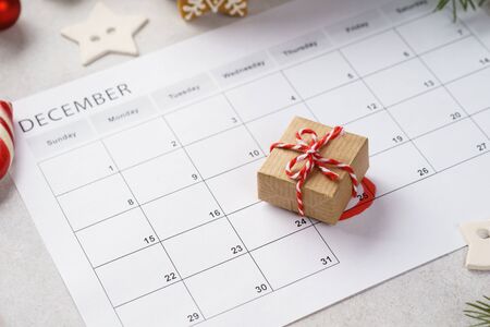 Planner page with Christmas gift box lying on 25th of December. Close-up shot. Winter holidays anticipation.