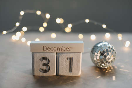 December 31 on white cubes calendar on a background with glowing garland. Christmas, winter, new year concept