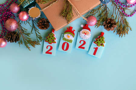 Christmas gift box, decorations, fir branches and year 2021 on a light blue background. Top view with copy space