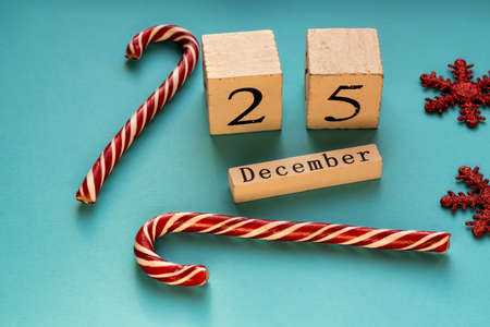 Wooden block calendar showing 25th of December. Christmas holiday. Greeting card with candy canes and sparkling snowflakes.