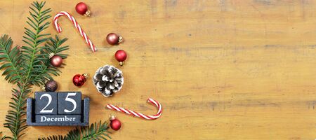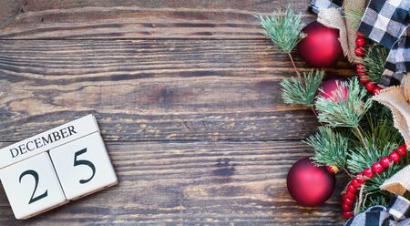 Wood calendar blocks with the date December 25th to mark Christmas Day with holiday trim of ornaments, black and white buffalo check ribbon, burlap and red bead garland.. Top view with copy space available.