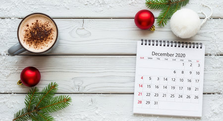 A warm cup of coffee sits next to a December 2020 calendar, surrounded by festive Christmas ornaments and pine branches.