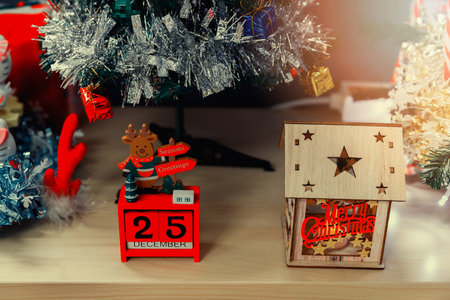 Christmas calendar with 25th December on wooden blocks and wooden lantern of Christmas light with decorations tree.