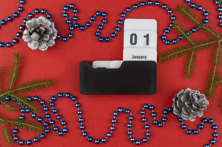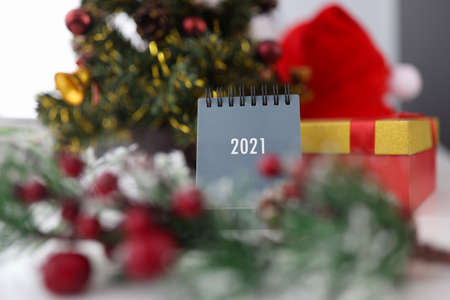 Christmas and New Year decorations on table with calendar for 2021. New year and christmas celebration concept