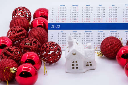 Red Christmas balls and house. 2022 calendar and Christmas tree balls. Souvenir house and 2022 calendar.