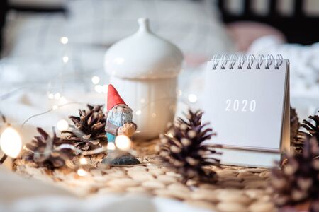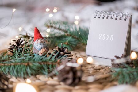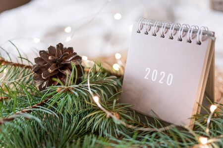 New Year 2020 grey calendar with lights on rustic server with cones and wooden Christmas tree toys