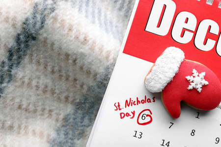 Saint Nicholas Day. Calendar with marked date December 06 and glove shape gingerbread cookie on plaid, top view. Space for text