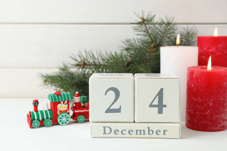 Christmas composition from wooden calendar cubes and Christmas tree decorations. December 25 - Christmas.