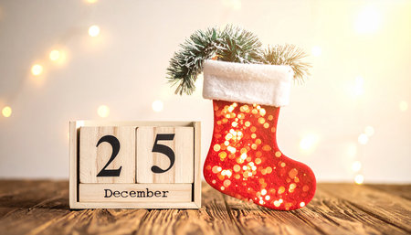 christmas decoration with wooden calendar 25 december and christmas sock