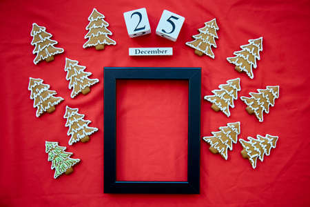 Christmas homemade gingerbread cookies with mock up frame and date of Christmas on red fabric background. Copy space. Festive aesthetic card. Christmas atmosphere. High quality photo